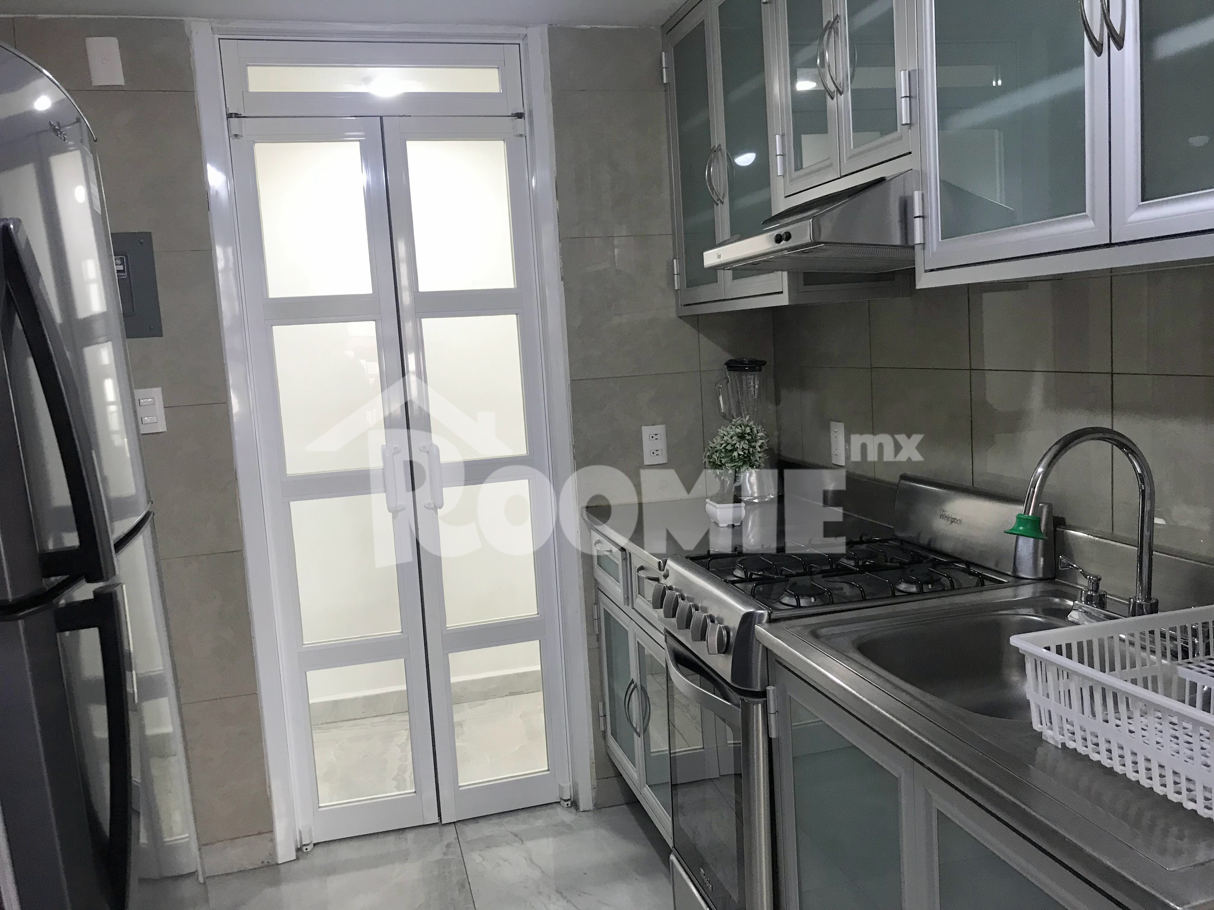 Este departamento cuenta con 4 habitaciones diferentes, podrás disfrutar de las áreas comunes como una cómoda sala, comedor y cocina integral equipada con todos los utensilios, también dispone de electrodomésticos que necesitas como refrigerador, microondas y lavadora. Además de dos baños completos, uno compartido y otro privado, los cuales cuentan con agua caliente las 24 horas los 7 días de la semana. Todas las habitaciones y áreas comunes están completamente amuebladas. El departamento se encuentra en la planta baja del edificio y puedes acceder por las escaleras o el elevador.