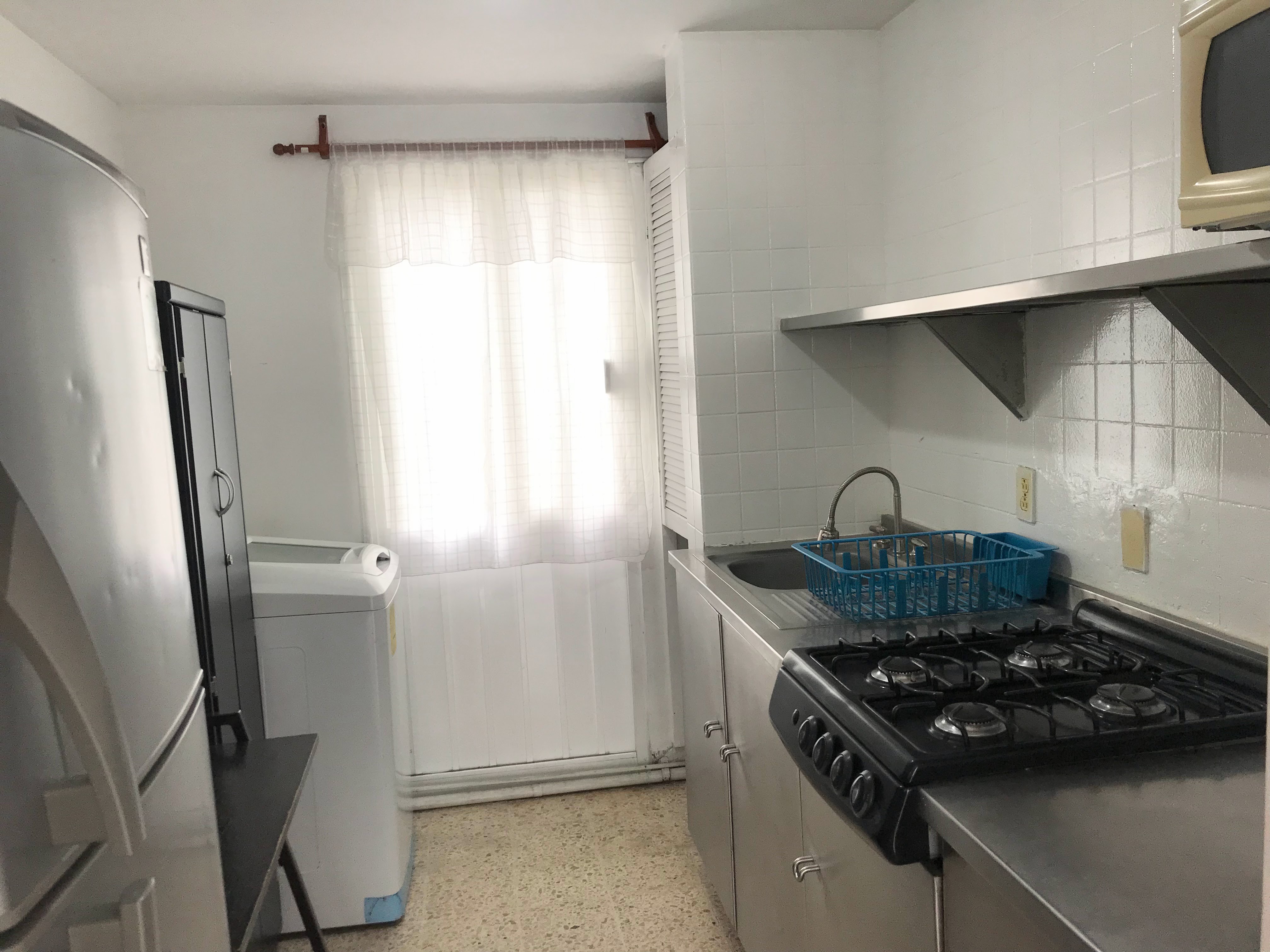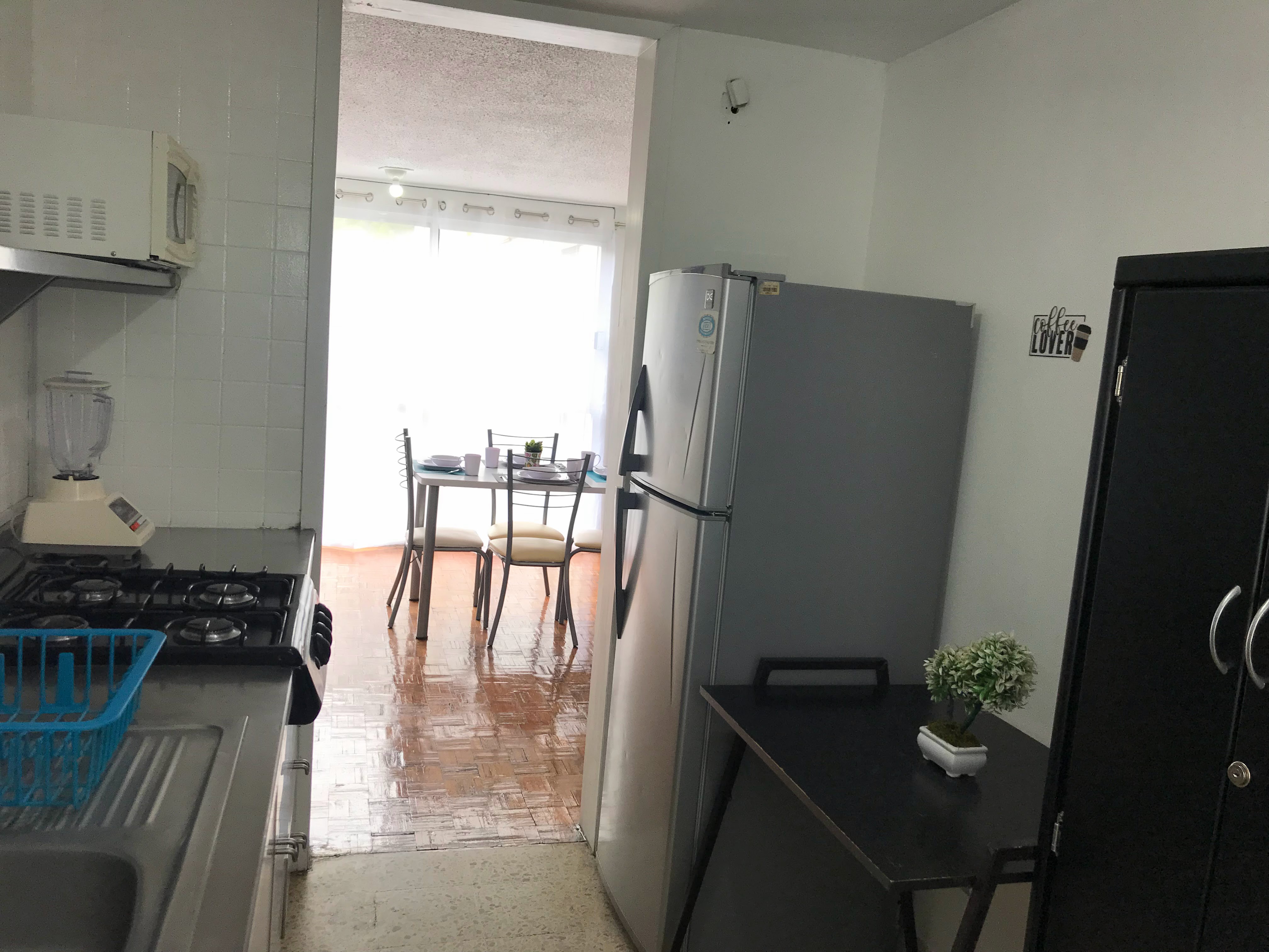 Este departamento cuenta con 4 habitaciones diferentes, podrás disfrutar de las áreas comunes como una cómoda sala, comedor y cocina integral equipada con todos los utensilios, también dispone de electrodomésticos que necesitas como refrigerador, microondas y lavadora. Además de dos baños completos, uno compartido y otro privado, los cuales cuentan con agua caliente las 24 horas los 7 días de la semana. Todas las habitaciones y áreas comunes están completamente amuebladas. El departamento se encuentra en el cuarto piso del edificio y puedes acceder por las escaleras o el elevador.