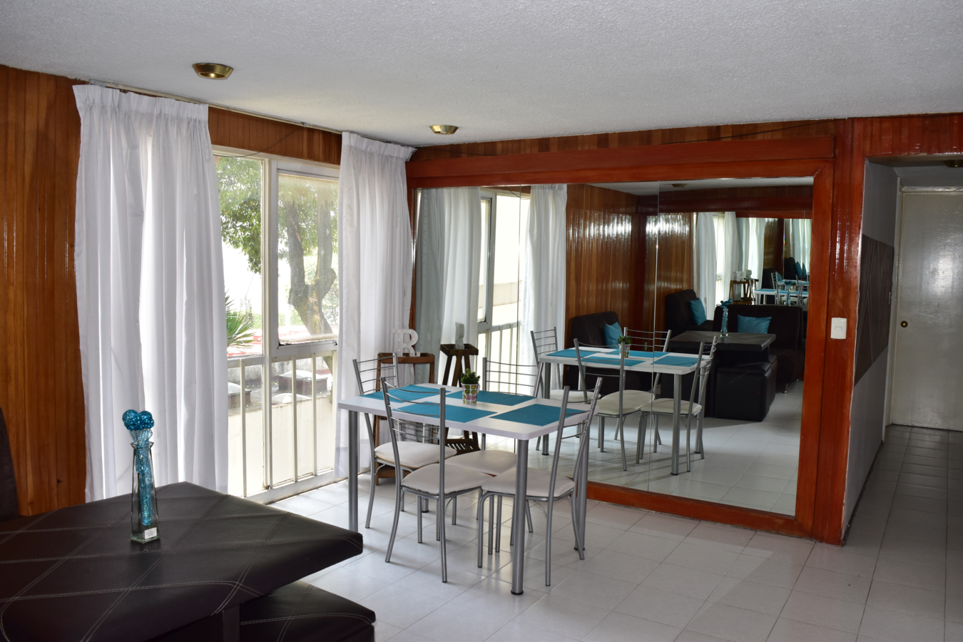 Este departamento cuenta con 4 habitaciones diferentes, podrás disfrutar de las áreas comunes como una cómoda sala, comedor y cocina integral equipada con todos los utensilios y electrodomésticos necesarios para que no te preocupes por traer los tuyos. Además de dos baños completos, los cuales siempre cuentan con agua caliente las 24 horas los 7 días de la semana. Todas las habitaciones y áreas comunes están completamente amuebladas. El departamento se encuentra en el primer piso.