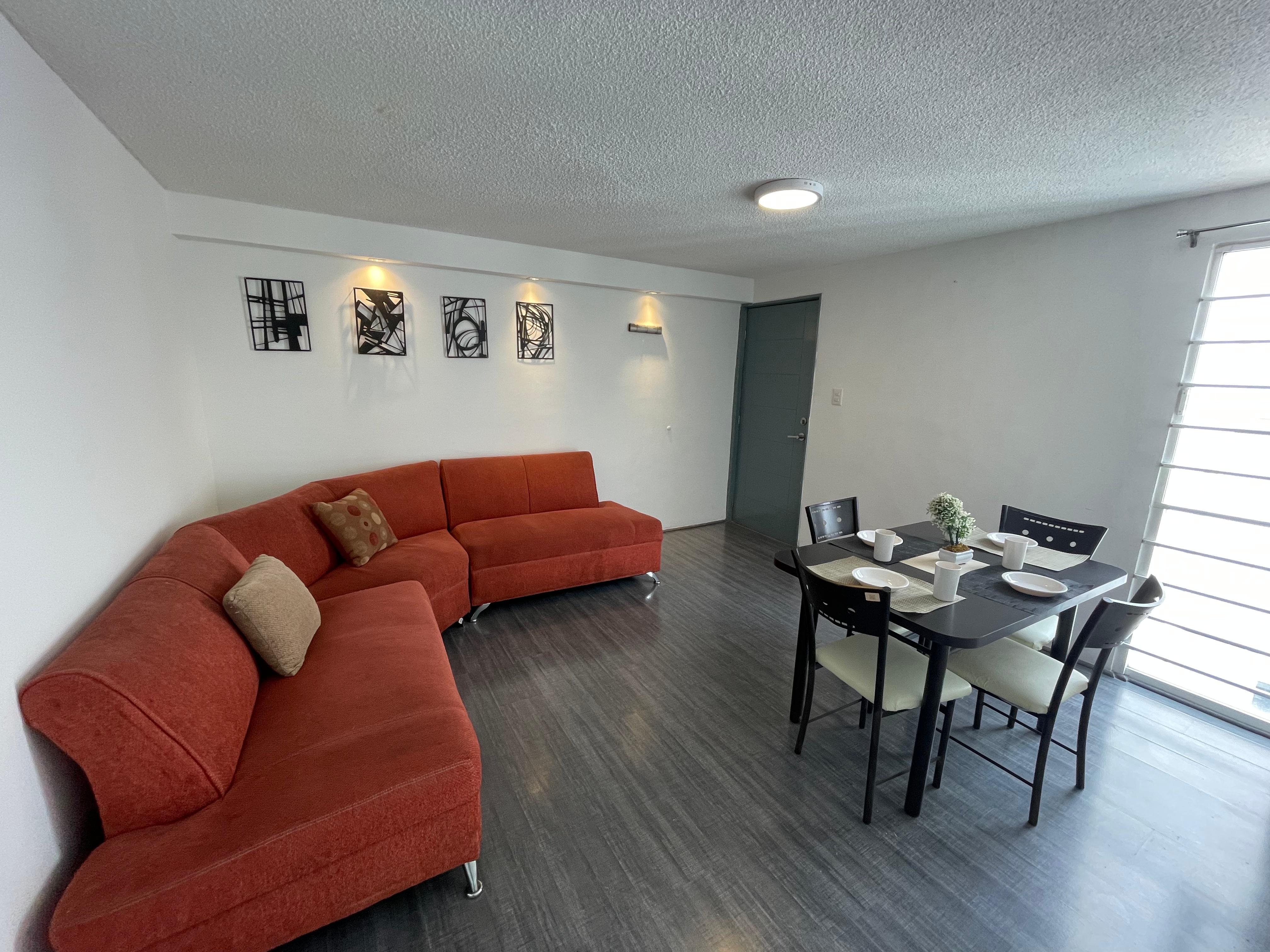 Este departamento cuenta con 4 habitaciones diferentes, podrás disfrutar de las áreas comunes como una cómoda sala, comedor y cocina integral equipada con todos los utensilios, también dispone de electrodomésticos que necesitas como refrigerador, microondas y lavadora. Además de dos baños completos, uno compartido y otro privado, los cuales cuentan con agua caliente las 24 horas los 7 días de la semana. Todas las habitaciones y áreas comunes están completamente amuebladas. El departamento se encuentra en el quinto piso del edificio y puedes acceder por las escaleras o el elevador.